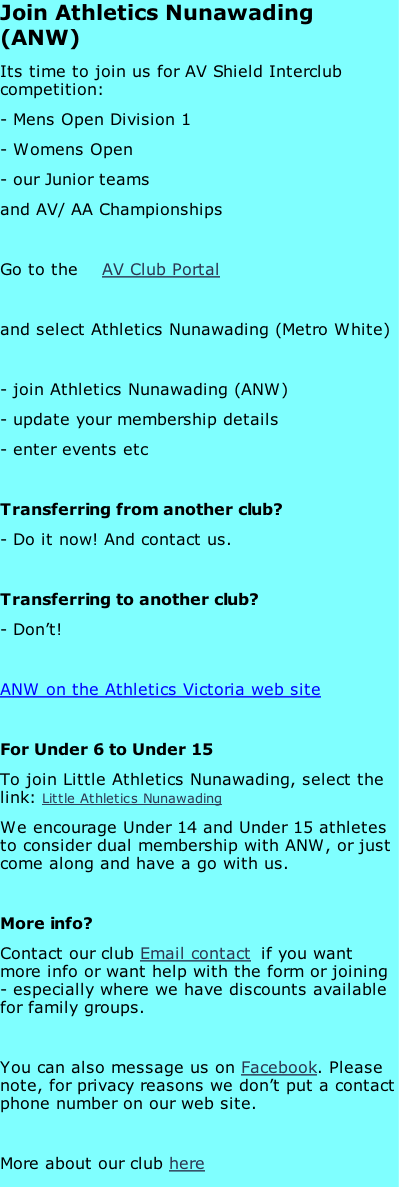 Athletes who are currently registered in the Little Athletics U15-13 age group at any LA Centre, can be dual registered members with Athletics Nunawading.